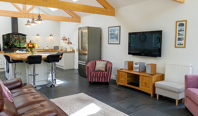 The open plan lounge has ample space for seating, so whether you prefer a leather or a fabric sofa, or a cosy chair, the choice is yours. The wall-mounted 46 inch TV is complemented with a Roku TV Stick and a Blu-Ray player, with various DVD's, Blu-Rays and CD's provided. On warm summer days, why not bring the ouside in - open the large patio doors and perhaps enjoy a meal on the patio.
