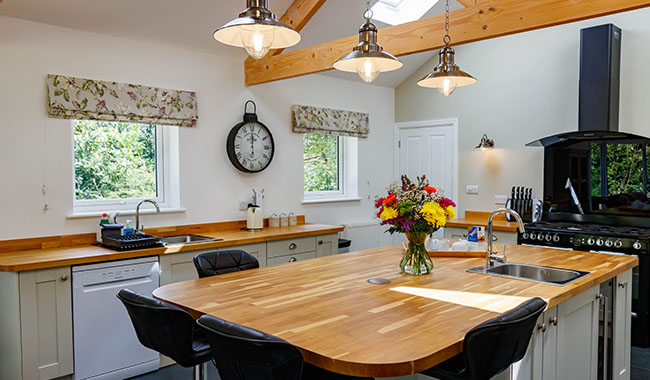 View MoreThe open plan kitchen is very spacious, with a generous kitchen island and breakfat bar, lit with contemporary lighting. Appliances include a double-oven range cooker, wine cooler, fridge freezer, dishwasher and washing machine. A prep-sink is also a feature of the kitchen island, for guests who like to prepare fresh produce.