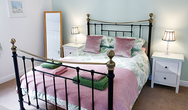 The bedroom is spacious, with a framed king-sized bed and bedside tables. A 43 inch Smart TV is wall-mounted, leaving ample space for a chest of drawers below. The comfortable bedroom chair is complemented by the floorstanding mirror and perfect for getting ready after a shower. A spacious built-in wardrobe with twin hanging rails, provides ample room for storage.